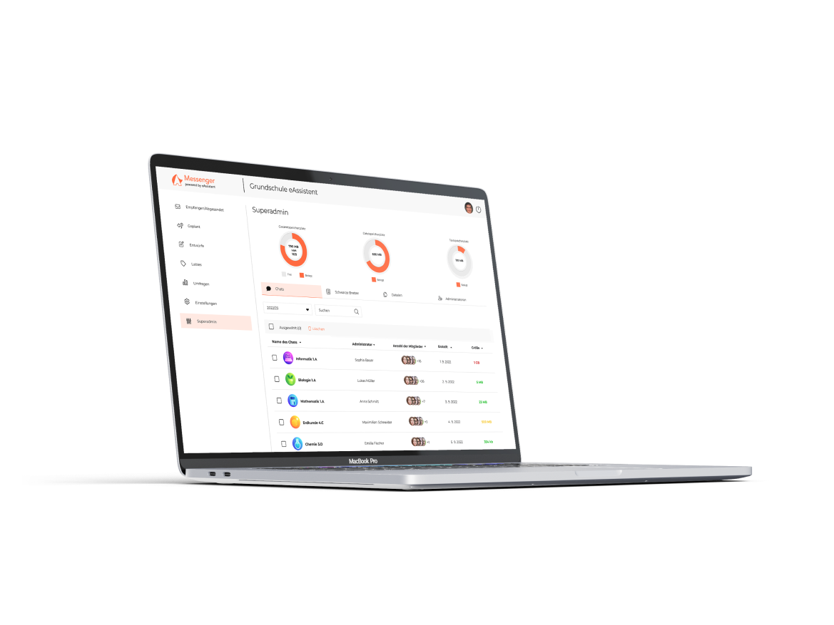 Das Adminstrator-Modul bietet Übersichtlichkeit, einfache Verwaltung von Chatadministratoren und Chat-Inhalten sowie die Kontrolle und Verwaltung der Speichernutzung.