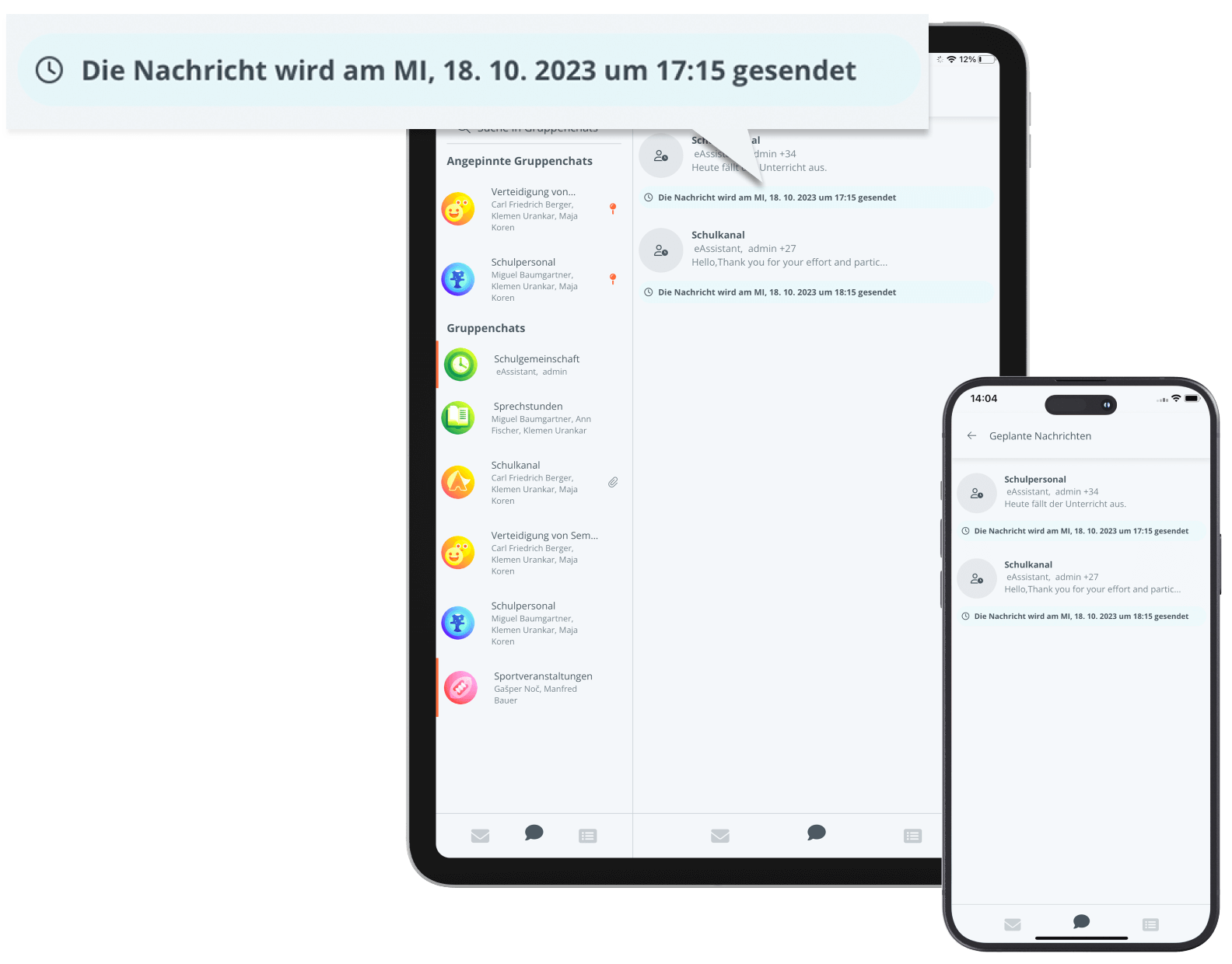 Der Stundenplan der Lehrkräfte und der anderen Mitarbeiter*innen ist normalerweise sehr voll, deswegen haben wir für Sie eine Lösung entwickelt, dass Ihnen ermöglicht, Nachrichten einfach als Entwürfe zu speichern, die Sie später beenden können. Sie können auch Nachrichten planen und sie am bestimmten Zeitpunkt senden.